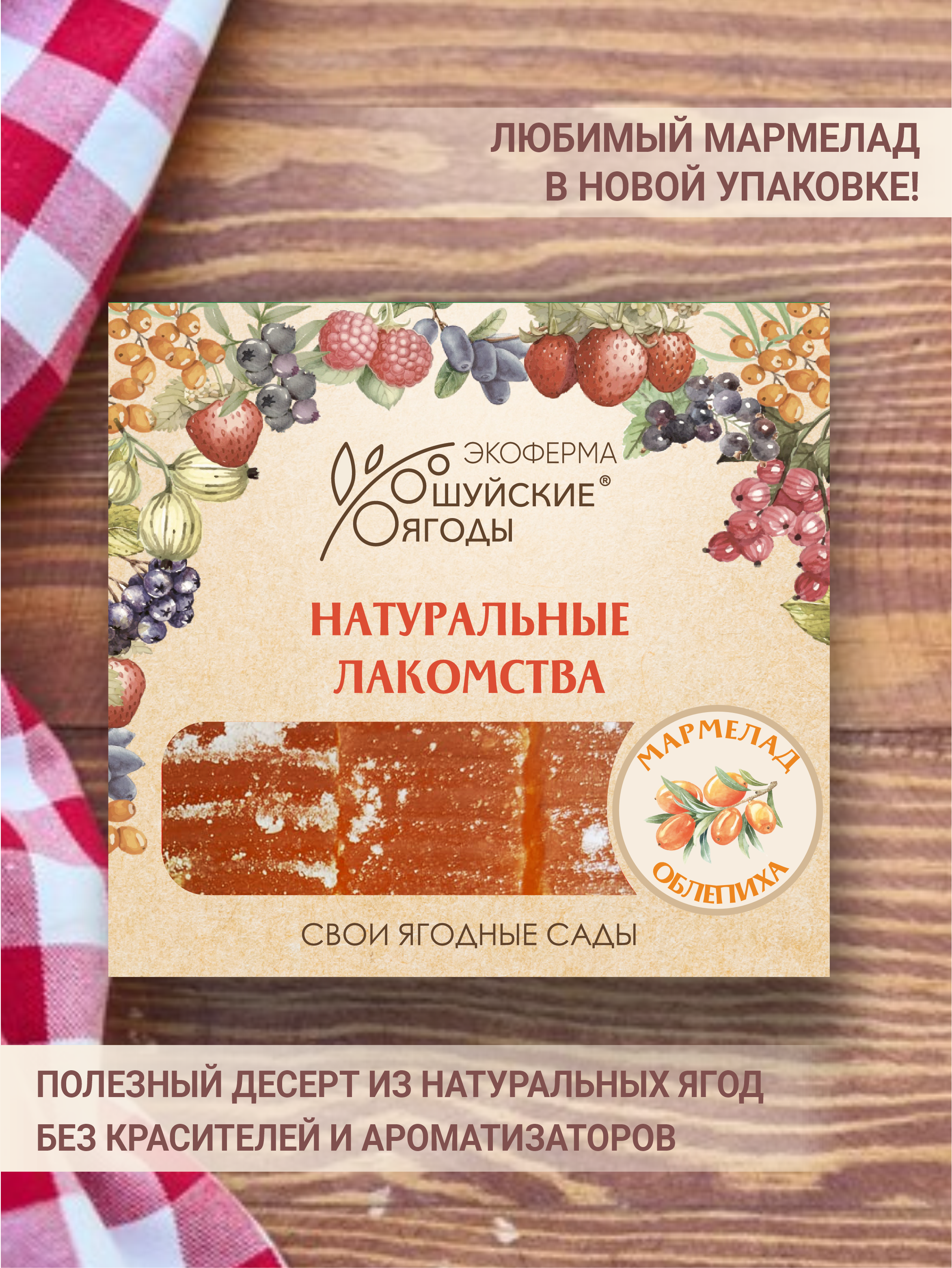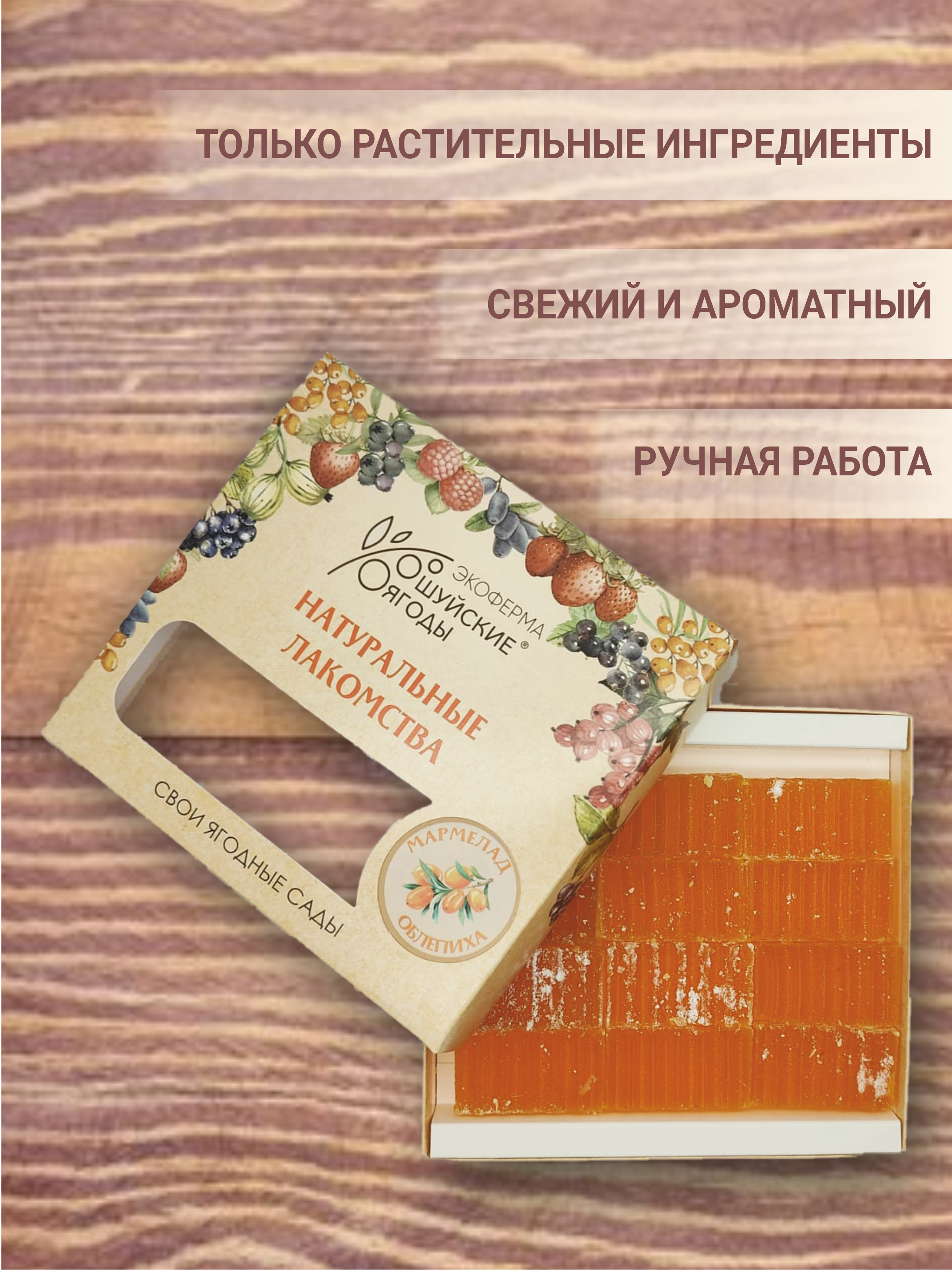 Мармелад «Шуйские ягоды» изготавливается на основе натурального сырья в виде облепихового пюре, приготовленного из ягод, собранных на нашей плантации. Наш мармелад в своем составе не содержит никаких пищевых добавок — ни ароматизаторов, ни красителей. Цвет и аромат придаёт натуральный ягодный состав.