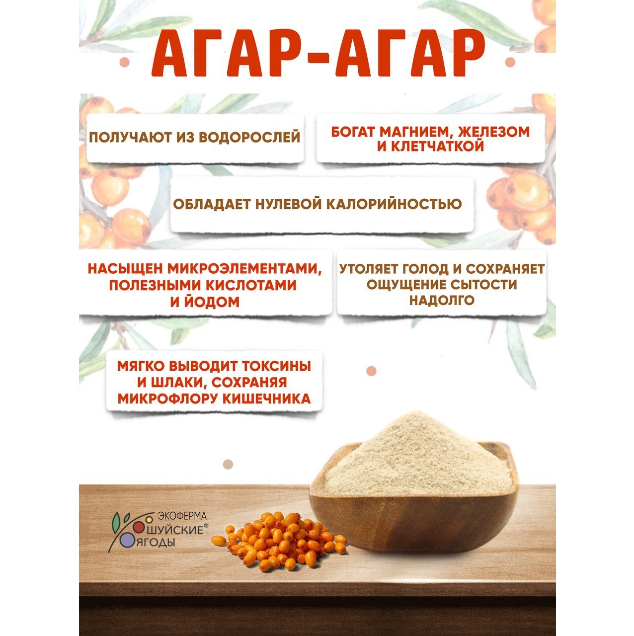 Мармелад из облепихи приготовлен на агар-агаре — это желирующий компонент, выделенный из бурых и красных водорослей (не содержит жиров). Полезные свойства для организма может проявлять только натуральный качественный мармелад. В ограниченных количествах он может даже включаться в рацион питания людей, соблюдающих диету. Особенно хорошо его использовать для перекуса, когда чувство голода становится нетерпимым.