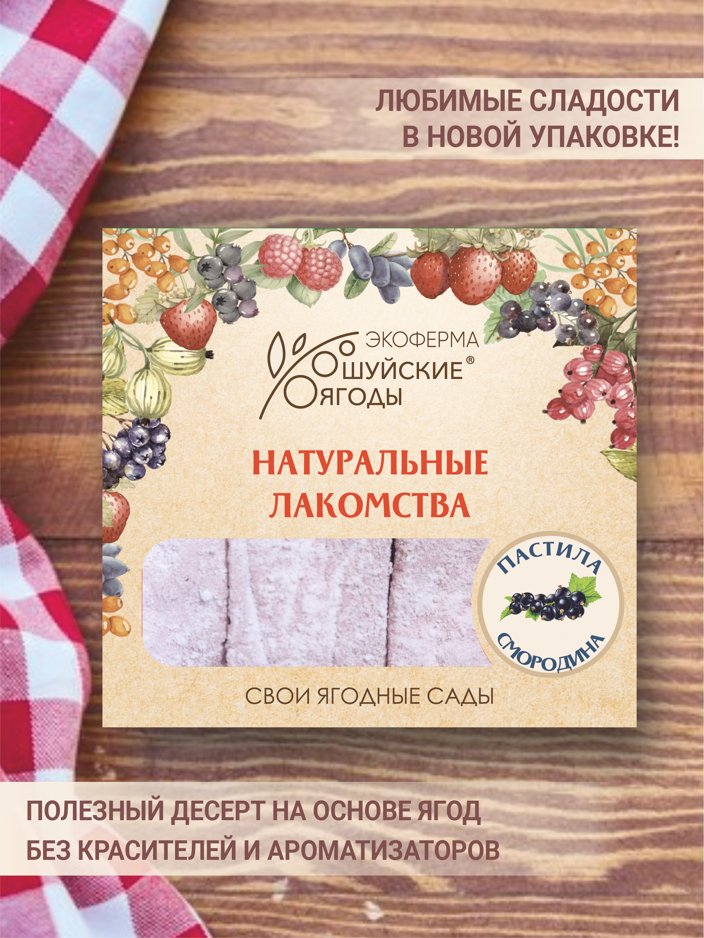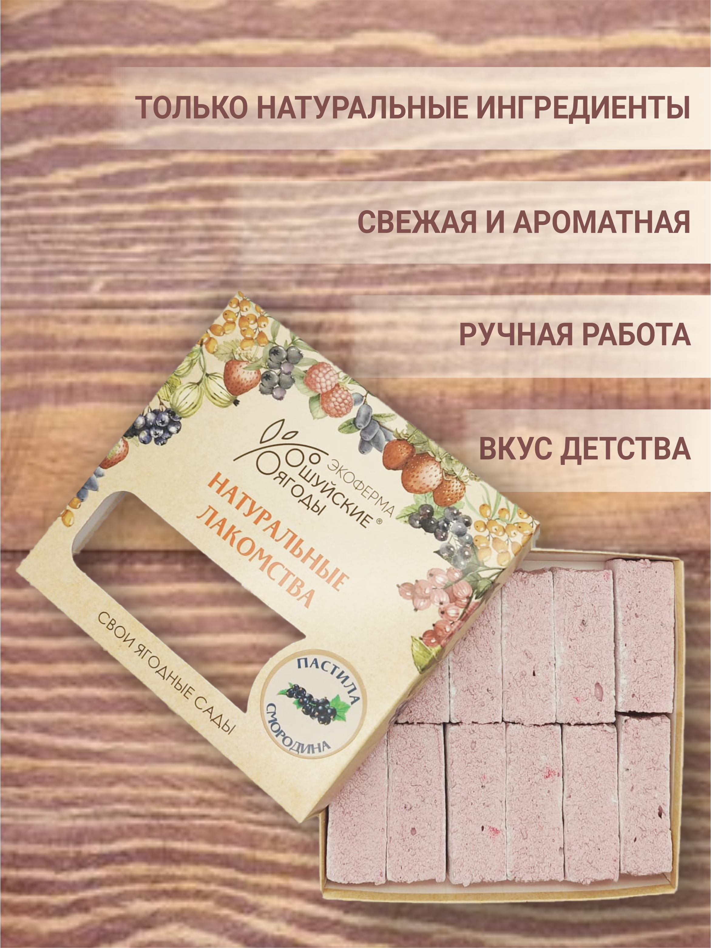 Пастила с натуральным пюре черной смородины — это нежнейшее лакомство с ароматом спелой черной смородины, которые покорит Вас с самых первых кусочков! Она не содержит консервантов, красителей, ароматизаторов и других вредных добавок. Ягодная пастила отлично подойдет в качестве полезного десерта к чаю или кофе — настоящая находка для любителей сладостей. Уже доступна в розничных точках продаж!