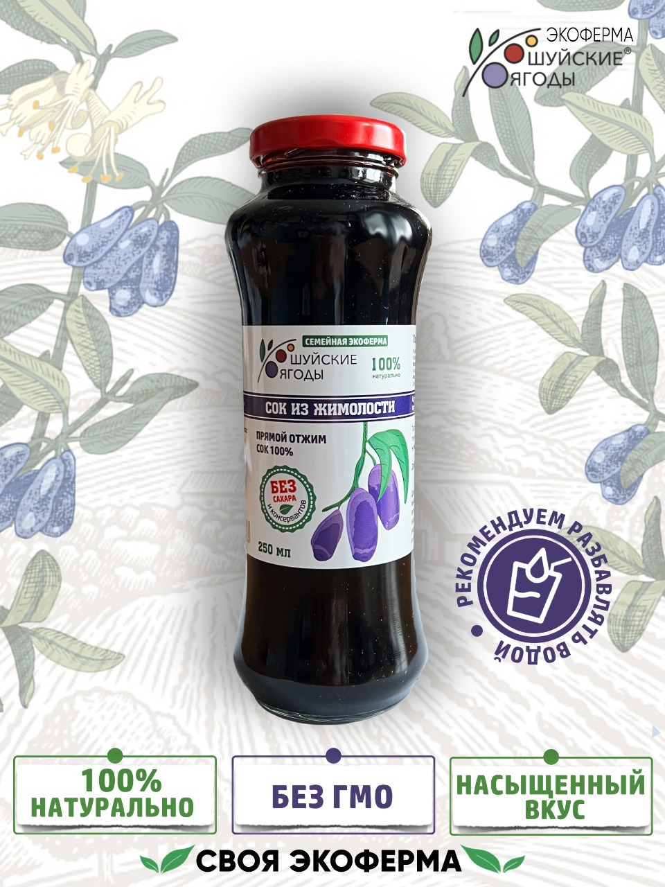 100% сок из жимолости производится в строгом соответствии с ГОСТом, без использования красителей, консервантов и усилителей вкуса. Ягоды жимолости очень полезные, они оказывают мощный антиоксидантный эффект, поэтому используются в качестве поливитаминного средства. Сок из жимолости отлично утоляет жажду, обладает приятным вкусом. Отсутствие сахара в данном напитке дает возможность пить его людям, страдающим диабетом, а также тем, кто худеет и поддерживает фигуру.