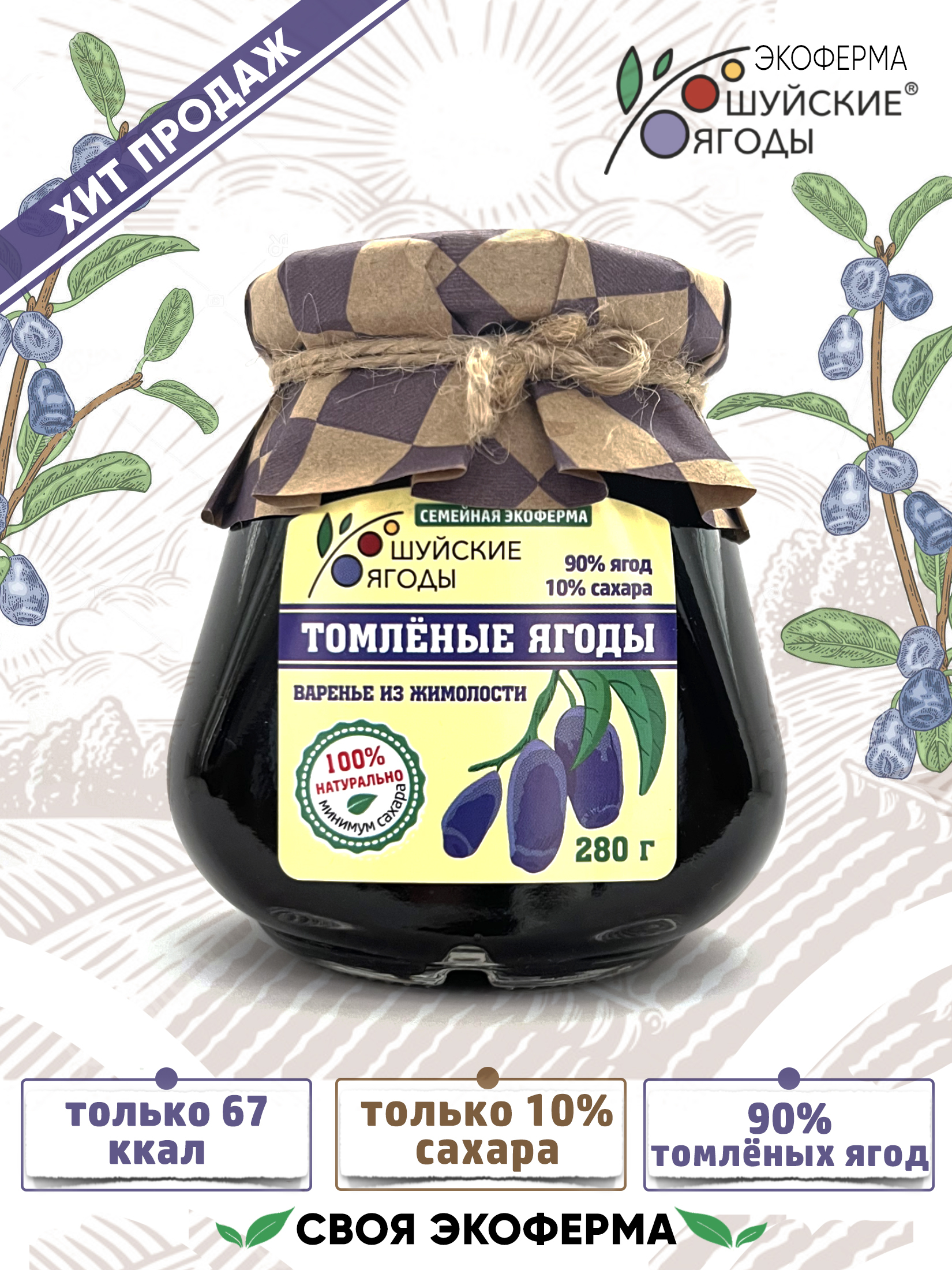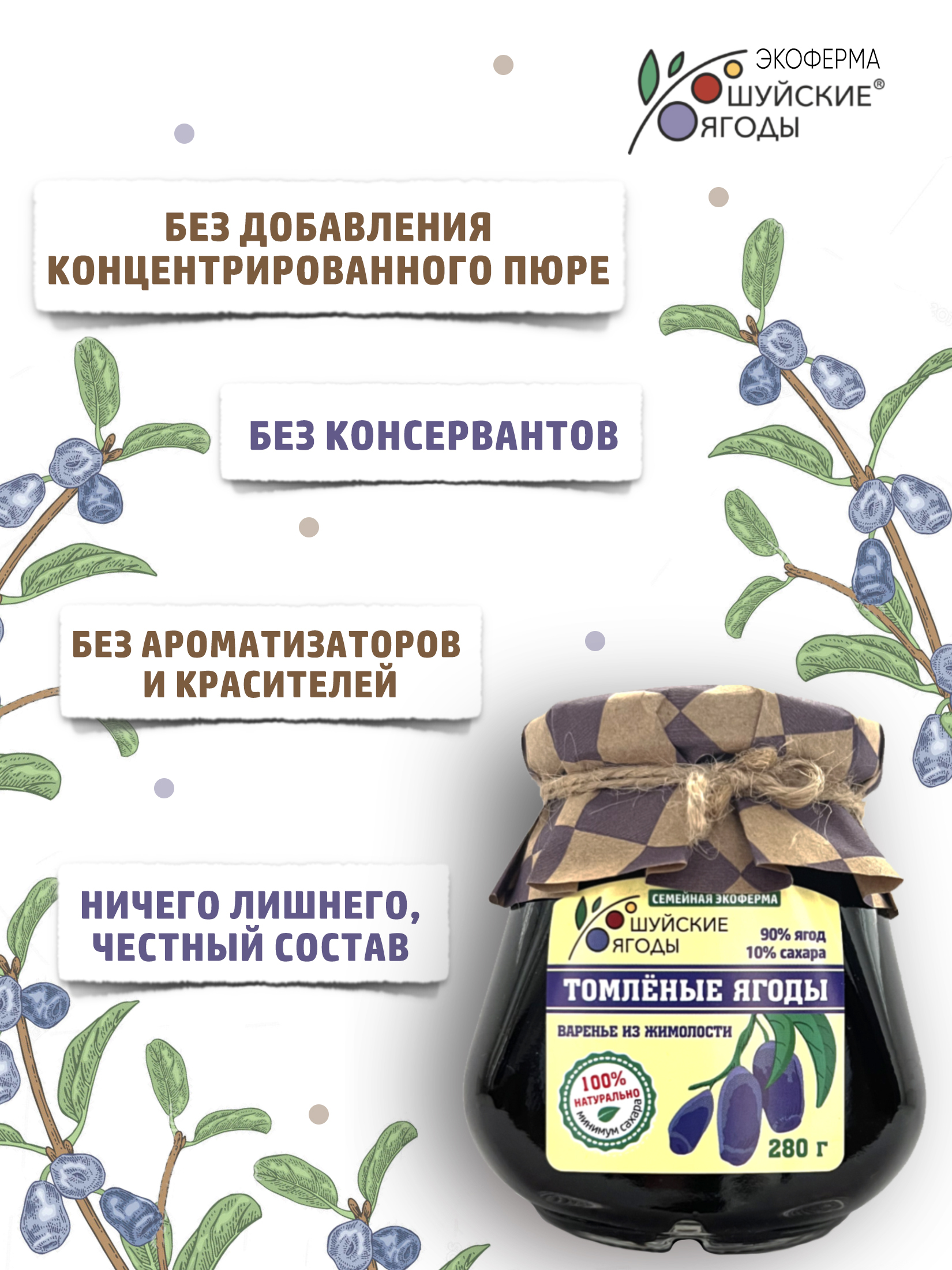 Томлёные ягоды жимолости от «Шуйских ягод» — это не варенье в привычном смысле, а результат медленного томления цельных ягод в собственном соку с добавлением всего 10% сахара.