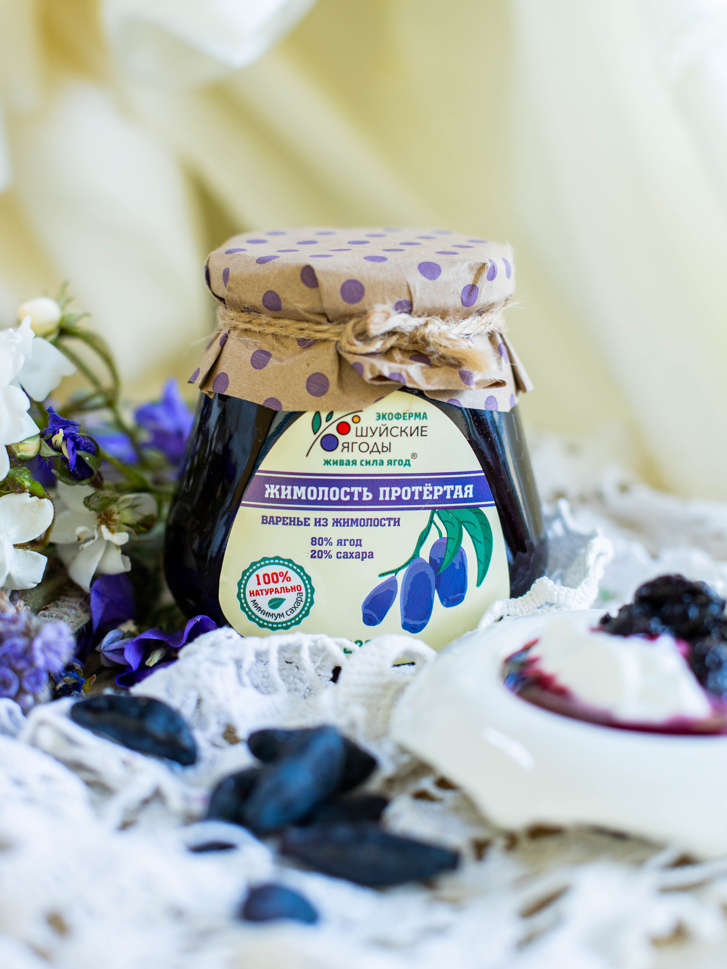 Жимолость — очень полезная ягода. Это источник витаминов, в частности витамина С, содержание которого в ней сравнимо с его содержанием в лимонах, поэтому 100 граммов жимолости удовлетворят суточную потребность в аскорбинке. Витамин P, который тоже есть в составе, помогает усвоению витамина. Употребление в пищу этой ягоды способствует борьбе с вирусными инфекциями, болезнями сердца и сосудов, а также сохранению молодости и чистоты кожи. Жимолость, протертая с сахаром сохраняет в себе почти все полезные свойства свежей ягоды, так как она не подвергается тепловой обработке. Все витамины остаются в неизменном виде и отлично усваиваются организмом. Содержание свежих ягод в такой баночке не менее 50%. Это лакомство можно использовать как отличную добавку к пище.